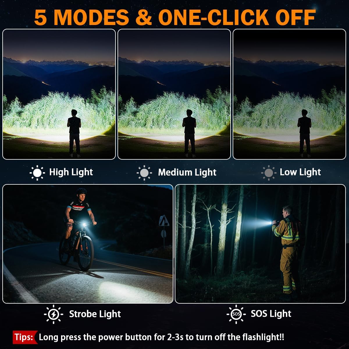 5 Modes & Adjustable Focus: Rechargeable flashlight offers 5 lighting modes: High, Medium, Low, Strobe, and SOS—all easily accessible with a single button. The adjustable zoom focus allows you to switch between a concentrated spotlight for long-distance viewing and a wide floodlight for broad area coverage, making it adaptable to any situation.