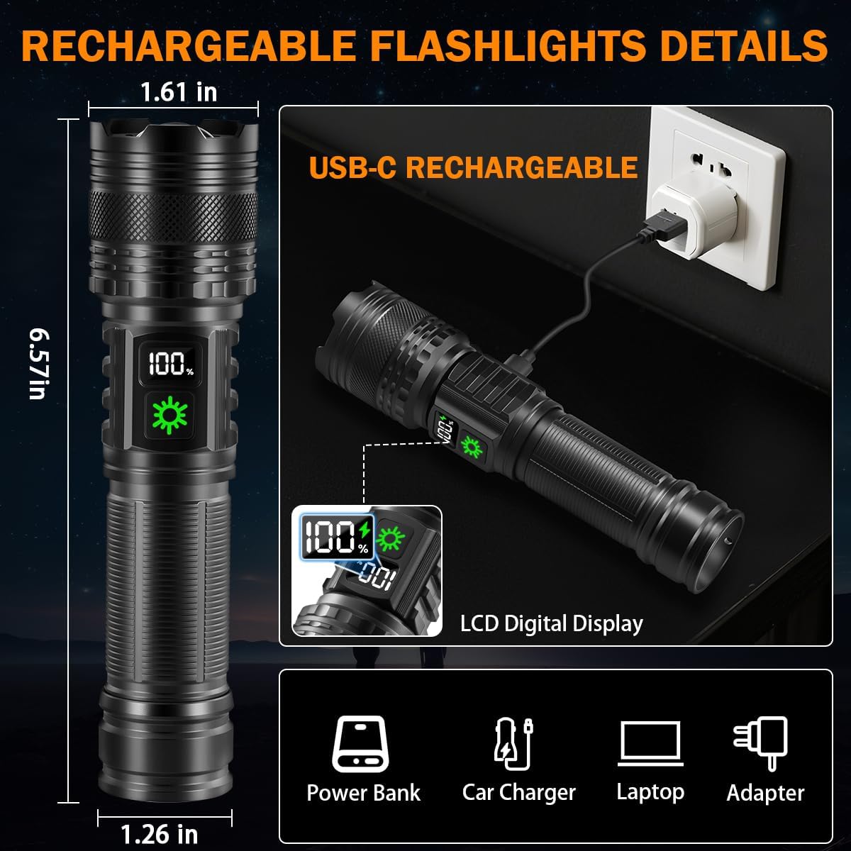 Rechargeable & Digital Display: Powerful flashlight features a large-capacity battery that delivers an extremely long work time —perfect for daily and emergency use. It supports fast Type-C charging with built-in protection against over-charging, over-voltage, and short circuits. The upgraded LCD digital display clearly shows real-time battery percentage, so you’ll always know exactly how much power remains.
