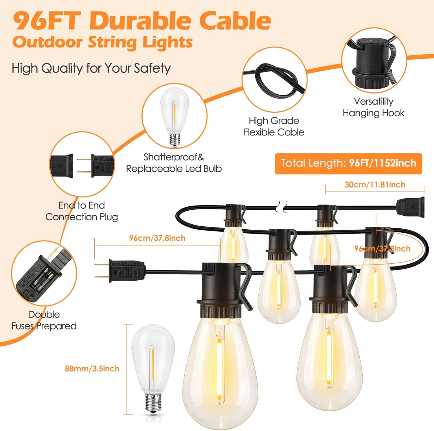 Decorative Ambiance Lights & Widely Used: Illuminate your backyard with our charming lights, whether it’s a summer barbecue or a holiday celebration, turn your outdoor event into a stunning visual experience! Suitable for bistro, porch, camping, balcony, gazebo, canopy, house, village, apartment, classroom, Christmas, party decoration. Package includes 1 pack of 96 ft 30 sockets lights, 3 spare bulbs and 1 user manual