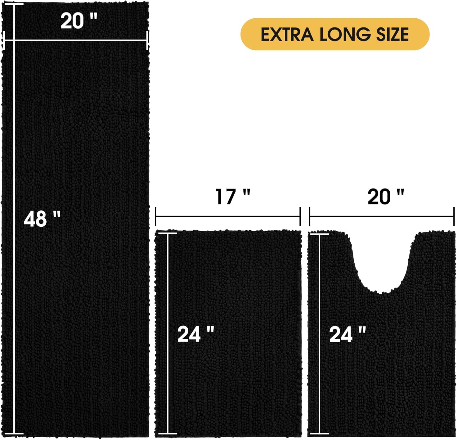LUXURY 3 PIECE BATHROOM RUG: Including 1 Extra Large Bath Rug 48″x20″, 1 U-Shape Contoured Rug 22″x24″, 1 Small Bath Rug 17″x24″. Made of 100% luxurious chenille fabric microfiber with higher pile than others. The thick and soft chenille helps soothe tired feet and keep your toes warm on the cold floor. The high density and plushness of the chenille offers exceptional comfort and support for your feet. You will feel like stepping on a cozy cloud to enjoy the ultimate luxury.