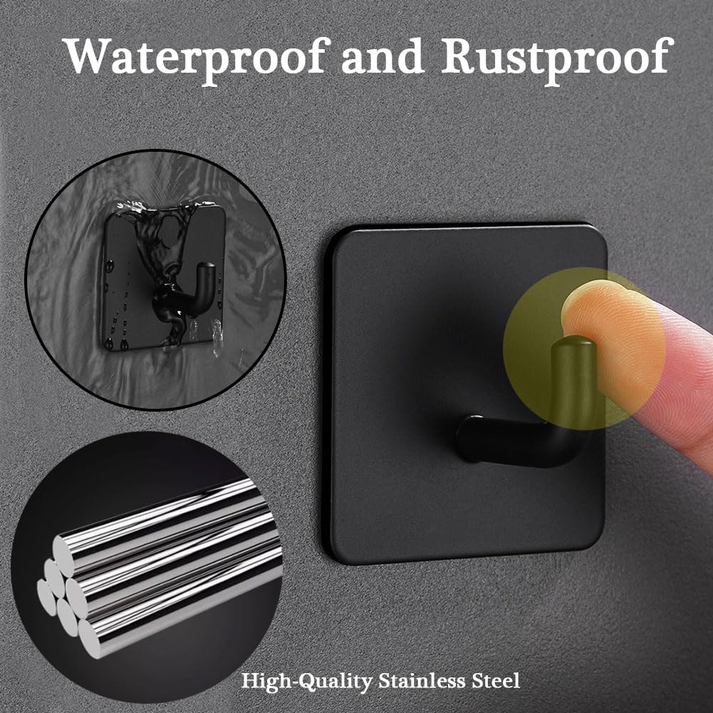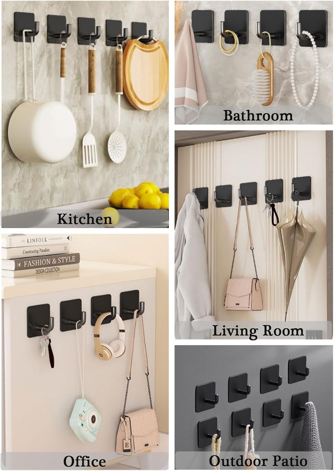 Black wall hooks are handy tools that stick to smooth surfaces such as wood, marble, tile, metal, glass and plastic without needing any tools.The stick on hooks for hanging are made of sturdy stainless steel; scratch resistance; matte black finish, minimal and sleek looking goes well in any decor.In other areas, they can hold accessories like keys, bags, coats, and hats, and even decorations like wreaths or welcome signs. These black towel hook make spaces look neat and stylish while helping you manage space better.