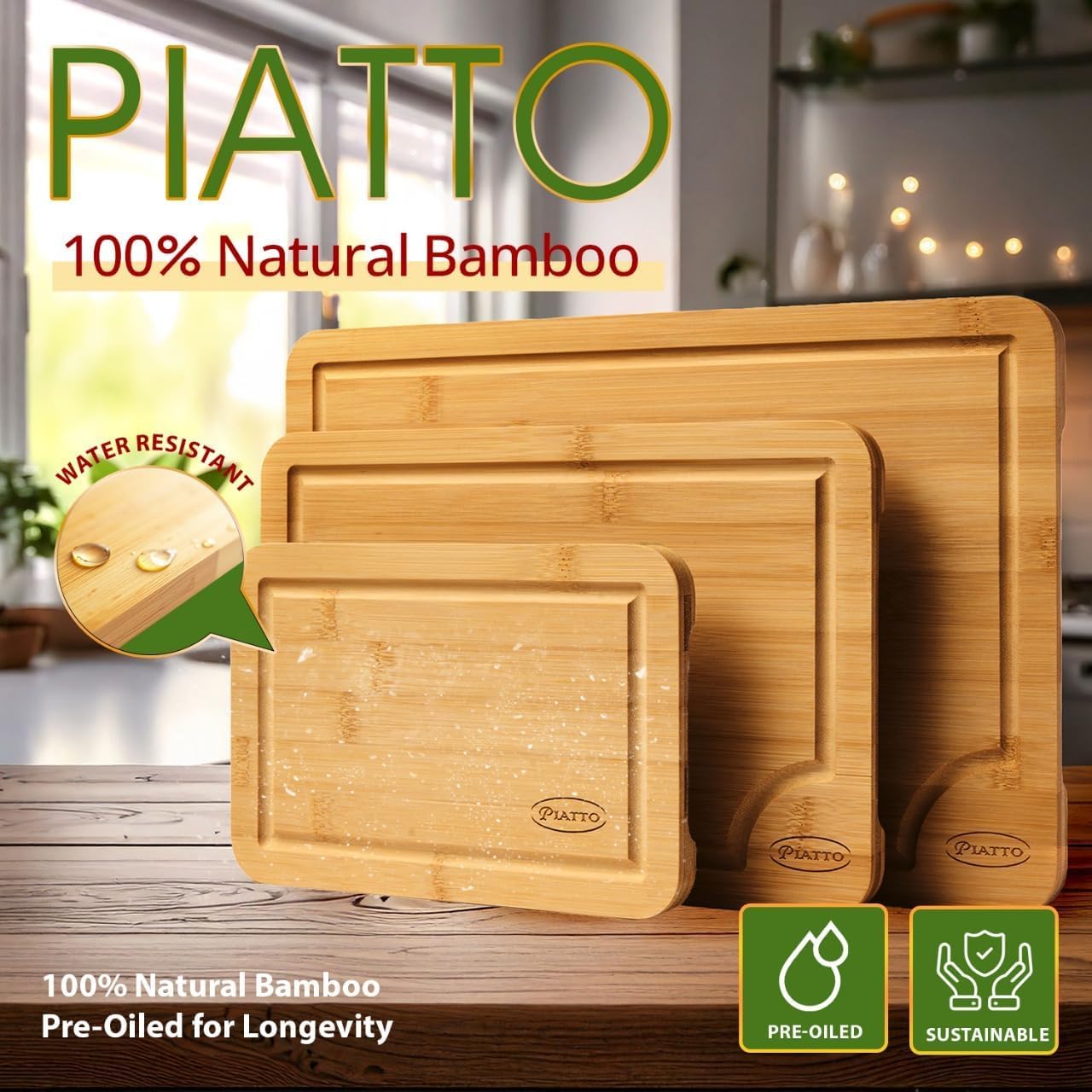 This set of bamboo cutting boards has exceeded all my expectations! The boards are not only beautiful but also incredibly durable and sturdy with the thick wood used. The different sizes are perfect for any kitchen task, from chopping vegetables on the medium board to carving a roast on the large one. The deep juice grooves are a fantastic feature, keeping my counters clean and tidy. Such a great value. I wish I would have made the switch from plastic to bamboo long ago! I highly recommend it!