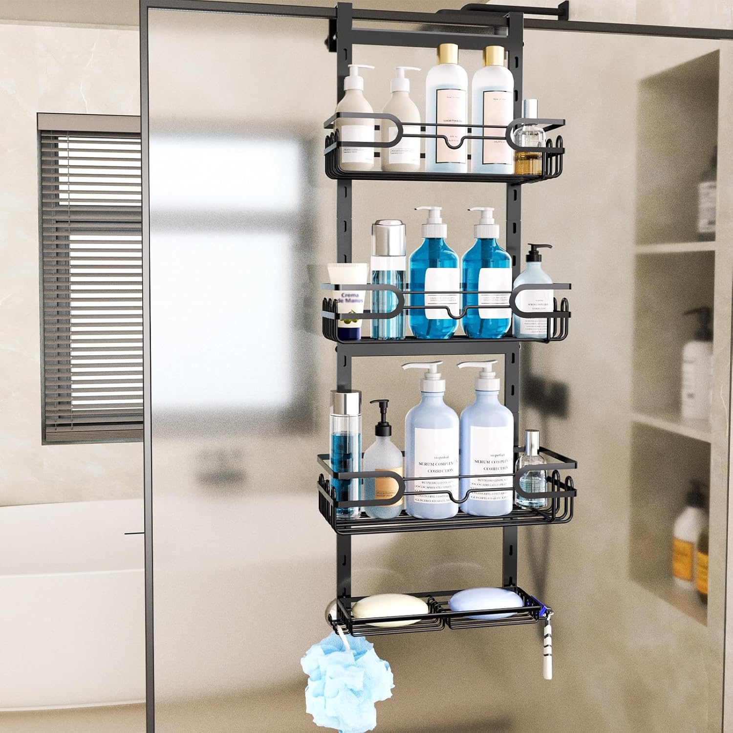 [Adjustable Height over the Door Storage Organizer]: Consumest Over the door shower organizer comes with 4 height-adjustable large capacity shelves, you can adjust the distance between each shelf according to your needs