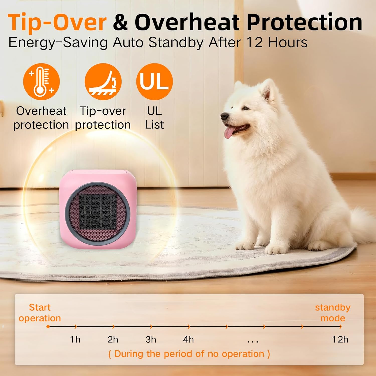 𝐓𝐫𝐢𝐩𝐥𝐞 𝐒𝐚𝐟𝐞𝐭𝐲 𝐏𝐫𝐨𝐭𝐞𝐜𝐭𝐢𝐨𝐧𝐬 – This UL Listed heater built-in overheat protection, a tip-over shut off function, and a 12-hour automatic shut off ensure safe use. Innovative desk heater effectively prevents safety hazards, saving energy, also providing a reliable heating experience